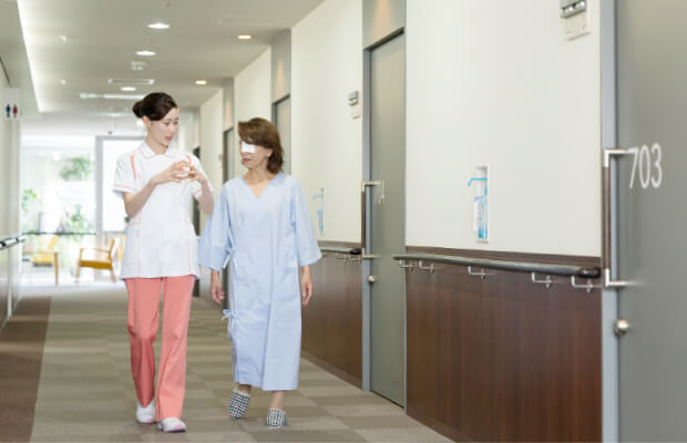 病棟フロア(6階〜8階)では「気配り」「思いやり」を第一にした看護に力を入れています。眼科の病棟であることから、高齢の方が多く、また内科的疾患を抱えている方も増えています。快適な入院生活を送っていただけるよう、スタッフ一同で協力しています。短期入院の患者さんが大半ですが、短いなかでも触れ合いを大切にし、「この病院に来て良かった」と思っていただける看護を目指しています。
