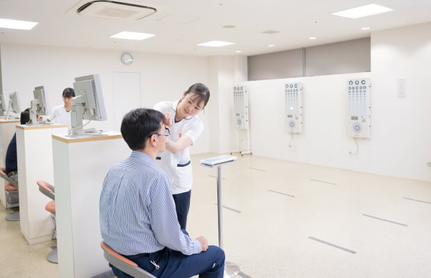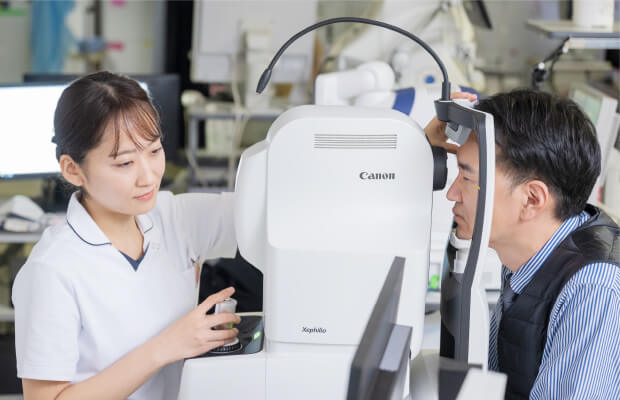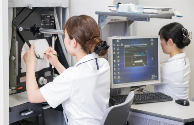 広範囲の眼底を一度に撮影できる『OPTOS』、眼底を3次元で画像化する『HRA』など、全国的にも珍しい高度な検査機器が豊富に揃っており、視能訓練士のモチベーションアップにつながっています。検査業務については、新人教育カリキュラムを通じてじっくりと習得していきます。